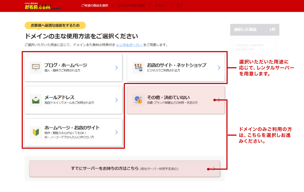 ドメインの主な使用方法から用途を選択