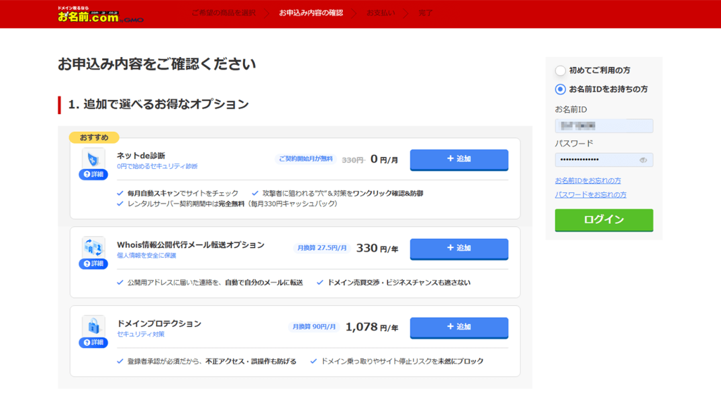 オプションは必要に応じて追加できます。お申込み内容はページ下部の「2.お申込み内容」からご確認ください。 ドメインを活用する場合はサーバーは必ず必要になるため、「レンタルサーバー」の申し込みをおすすめします。