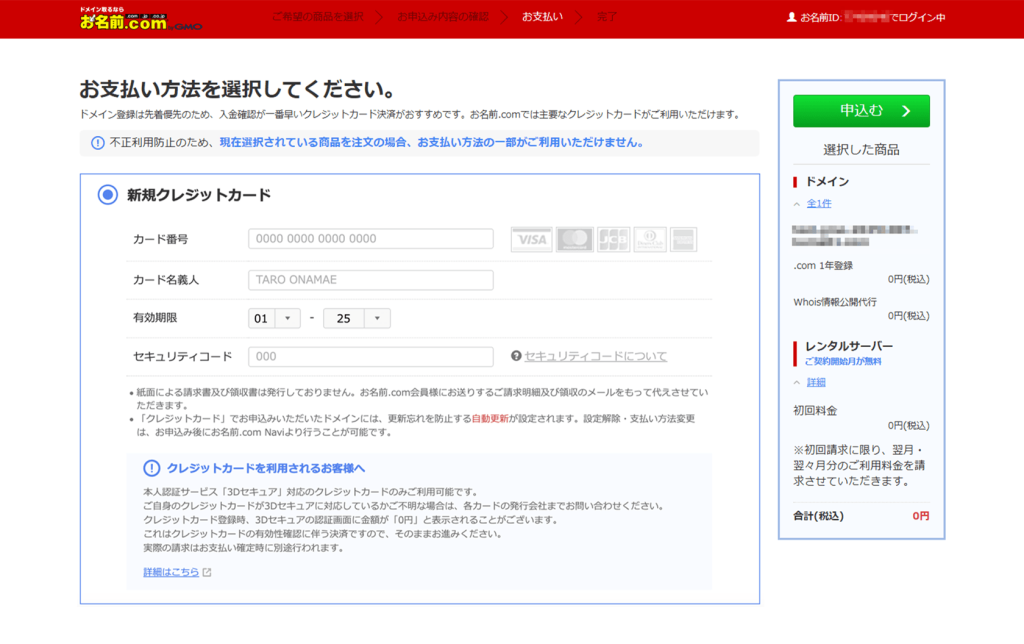 各種お支払い方法より選択・入力後、「申込む」をクリックしてください。