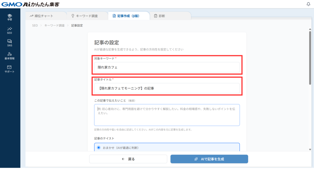 「記事の設定」画面に移動したら、検索上位をねらいたい「対象キーワード」を入力します。