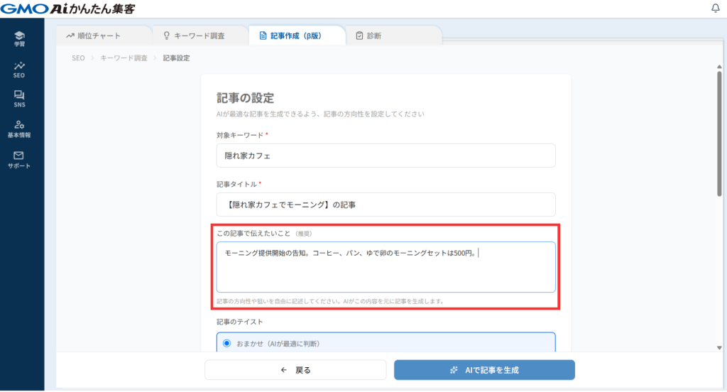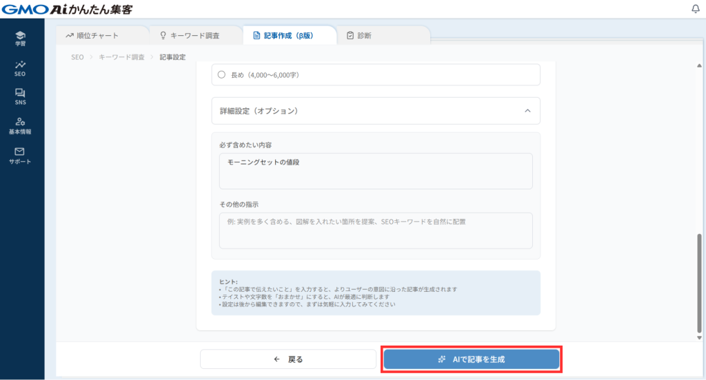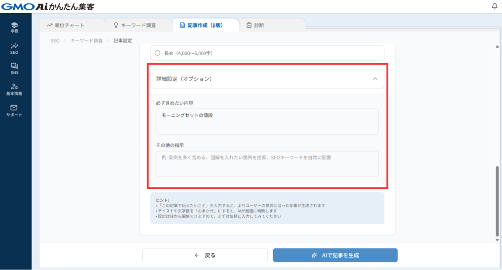 より精度を高めたい場合は、詳細設定で「必ず含めたい内容」などを入力することも可能です。