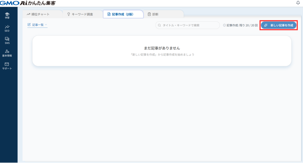 「記事作成」のタブから、「新しい記事を作成」の青いボタンをクリックします。