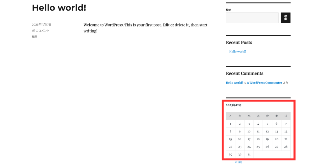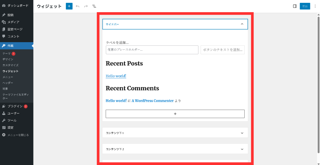 サイドバーやコンテンツ下などウィジェットを追加したい項目をクリックします。ここでは、サイドバーを選択します。