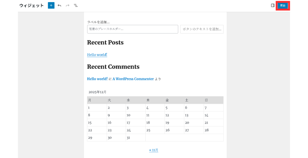 ウィジェットを選択した後、画面右上の「更新」をクリックすると、実際のページにウィジェットが反映されます。