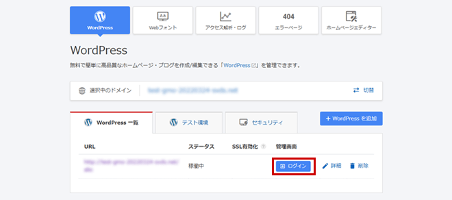 ホームページを作成したいURLの右側にある「ログイン」ボタンを押します。