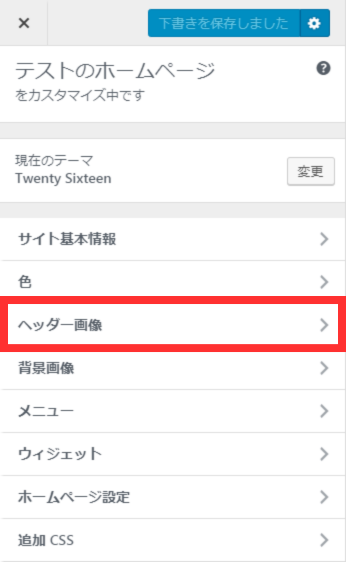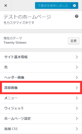 以下の画像は例として「Twenty Sixteen」のテーマを使用しています。また、テーマによりこの画面や名称が違う場合があります。