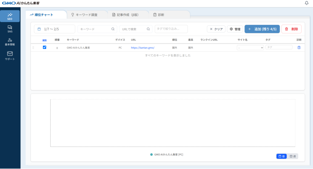 キーワードを変更したい場合は、右上の「削除」ボタンから削除可能です。また、キーワードが登録された直後は「圏外」と表示されますが、キーワードは前日の順位を取得する仕様なので、2日後に順位を確認いただけます。