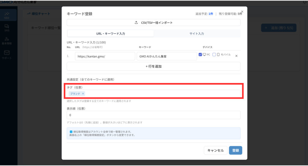 タグは、そのキーワードの順位を「何のために」確認するかの目印なので、「集客用」「○○ターゲット用」「最重要KW」など、目的に合わせて設定することをお勧めします。分からない場合は入れなくても問題ありません。