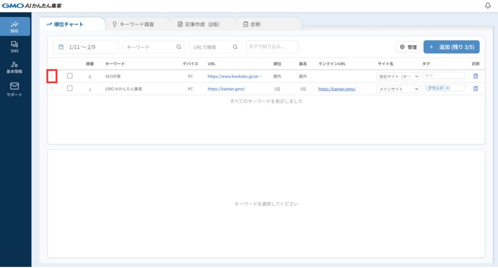 キーワード一覧の一番左(チェックボックスより左)にある6つの点々あたりをクリックします。色が水色に変わるので、好きな位置にそのまま移動しましょう。