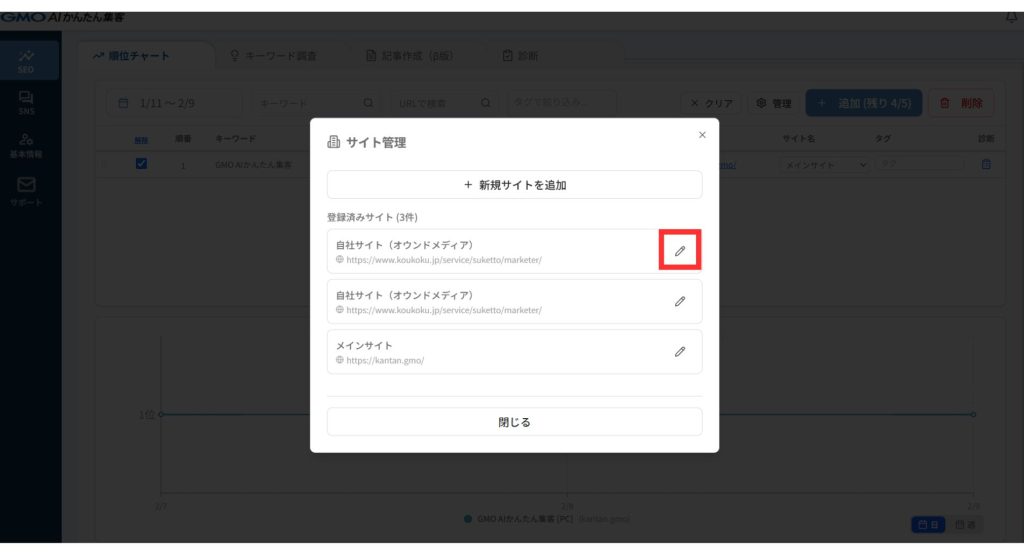 登録済みサイト一覧から、変更したいサイトの横にある鉛筆マークをクリックします。