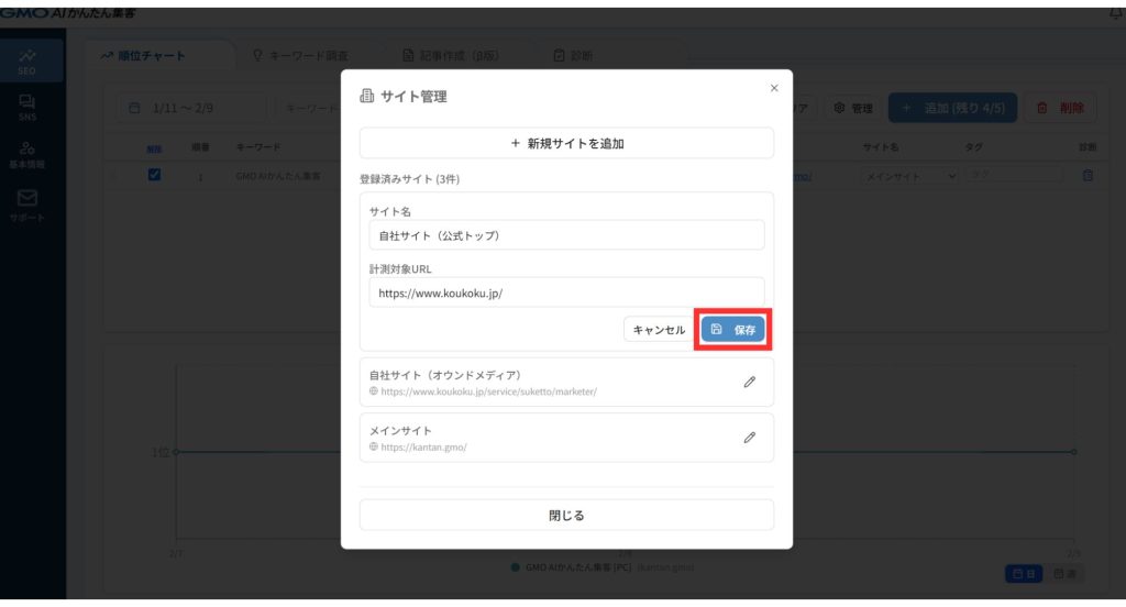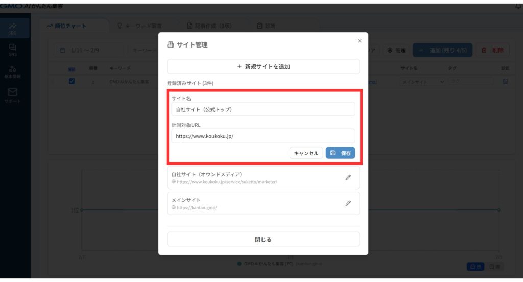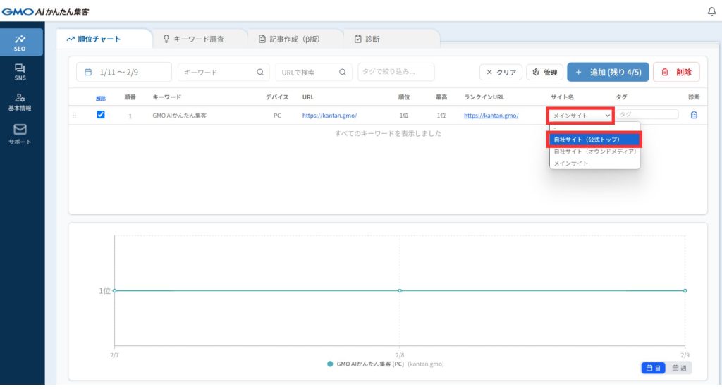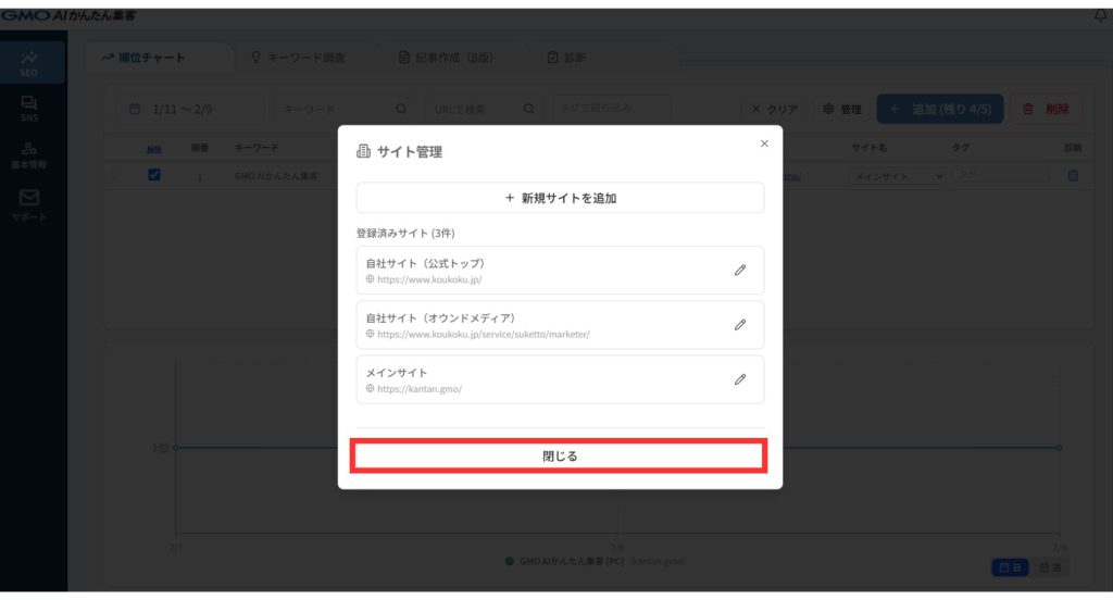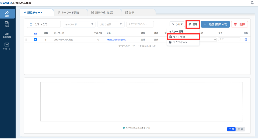 「順位チャート」を開き、追加ボタンの左にある「管理」ボタンをクリックしたのち、「サイト管理」を選択します。