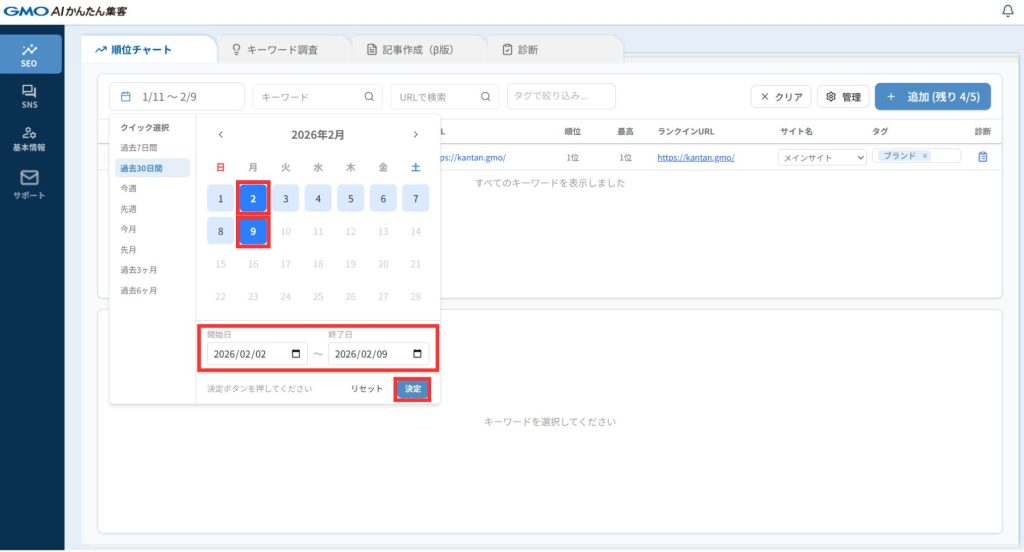 左上の日付が表示されている枠をクリックし、確認したい日付を選択したのち、「決定」をクリックします。