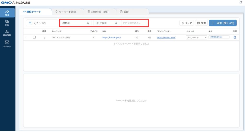 特定の条件でキーワードを絞り込みたい場合は、「キーワード」「URL」「タグ」から絞り込めます。複数条件の組み合わせも可能です。