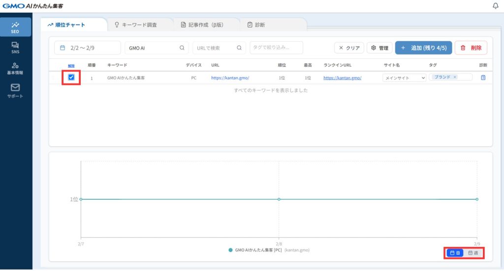 順位を確認したいキーワードにチェックをつけます。チェックをつけると下に推移が表示されるため、右下の「日」「週」を切り替えて好きな期間で確認しましょう。