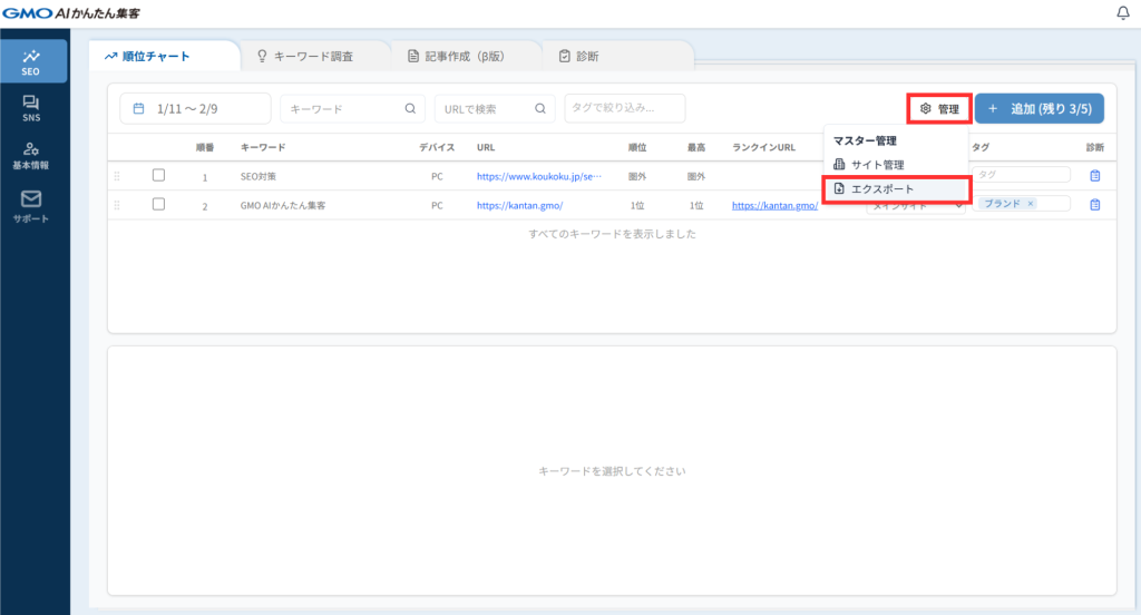 「順位チャート」を開き、追加ボタンの左にある「管理」ボタンをクリックしたのち、「エクスポート」をクリックします。