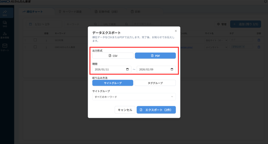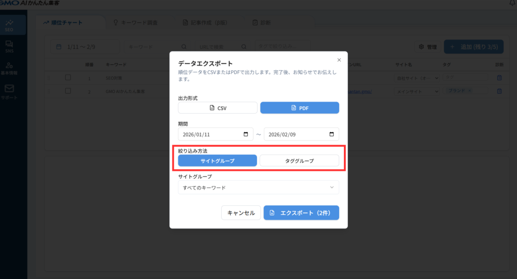 レポートを分けたい場合は、サイトグループ、またはタググループで絞り込み方法を選択します。