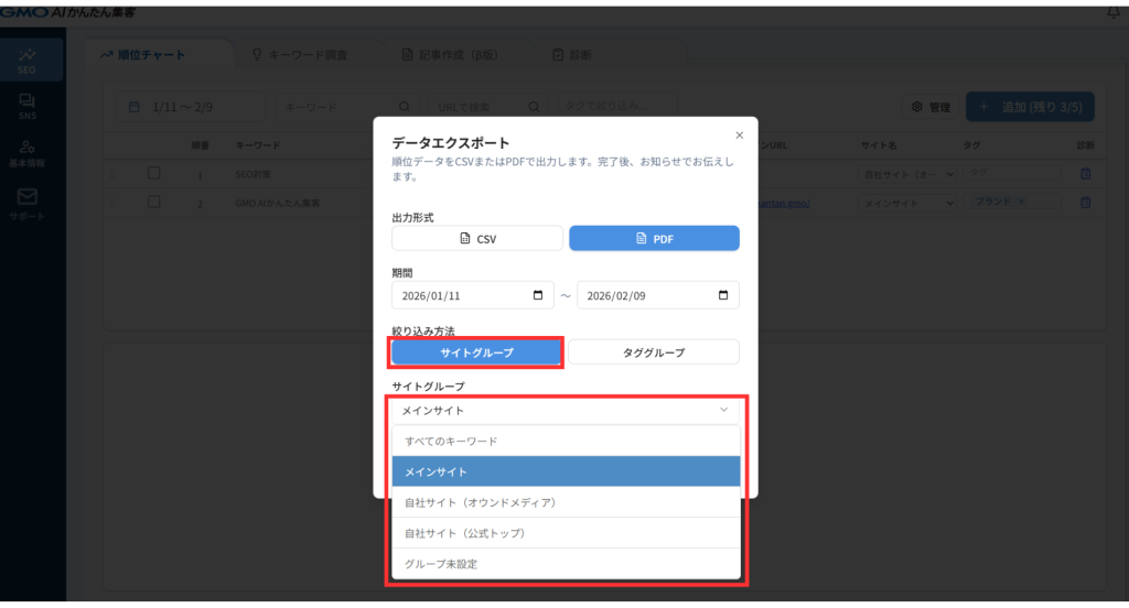 絞り込む場合は、サイトグループ、またはタググループのプルダウンから選択してください。