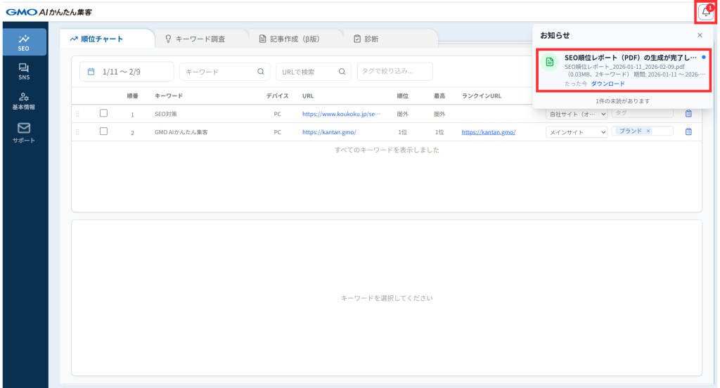お知らせアイコンをクリックし、対象のお知らせを選択するとダウンロードされます。必要に応じて名前を変更して保存してください。