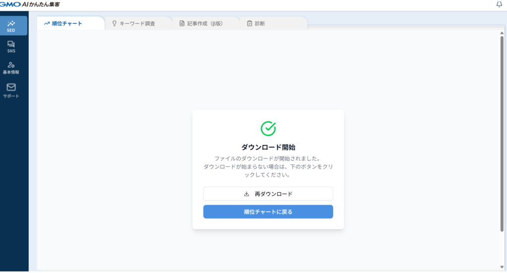 ダウンロードが開始しない場合、「再ダウンロード」を押すともう一度ダウンロード可能です。