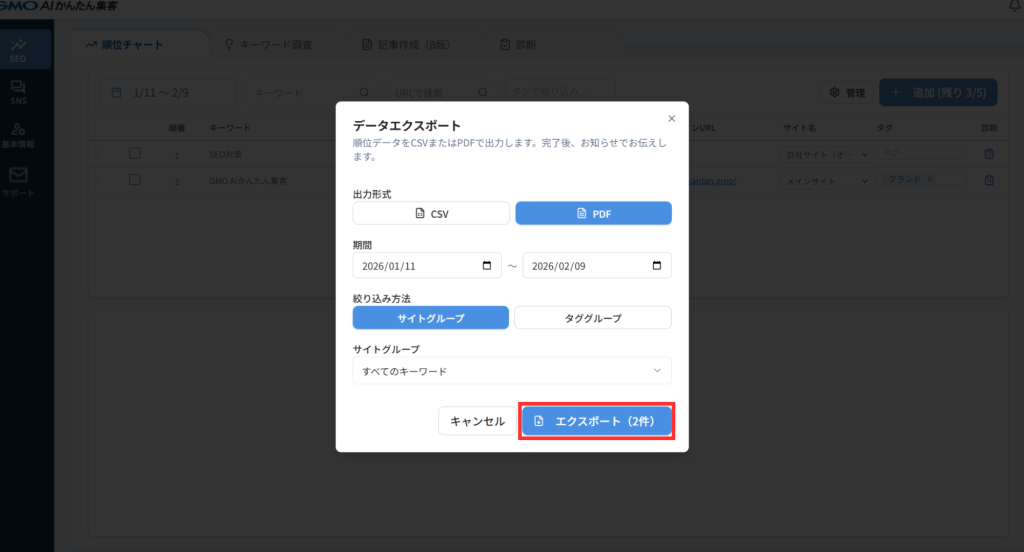 レポートを分けなくていい場合は、絞り込まずに「エクスポート」ボタンをそのまま押します。