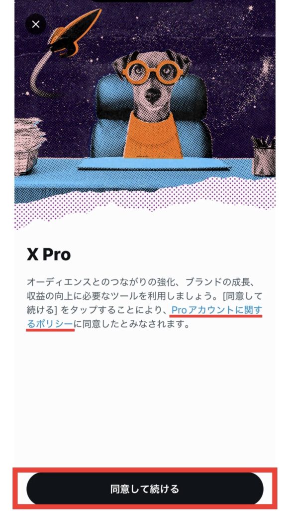 編集画面から「Proに切り替え」をタップし、X Proの画面で「同意して続ける」をタップします。