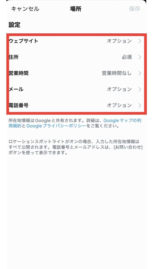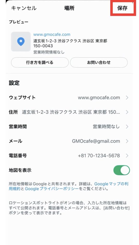 住所や連絡先を入力します。必要に応じて、公式サイトのリンクや営業時間も設定しましょう。