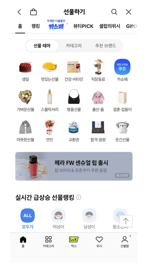 KakaoPayは韓国で広く使われるキャッシュレス決済サービスで、銀行口座やクレジットカードと連携して簡単に支払いが可能です。また、KakaoTalk Giftでは友人に商品をプレゼントできる機能があり、ECとの連携が強力です。企業はこの仕組みを活かして、ギフト型の販促やコラボキャンペーンを展開できます。(画像:KakaoTalk Giftのホーム画面)