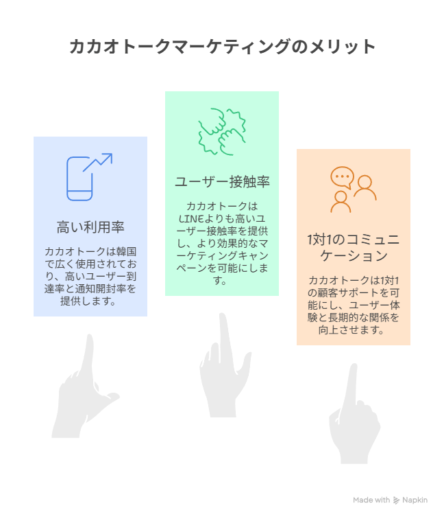 カカオトークを活用する最大の魅力は、ユーザーとの接触率と信頼性の高さです。ここでは、企業が得られる具体的なメリットを整理します。