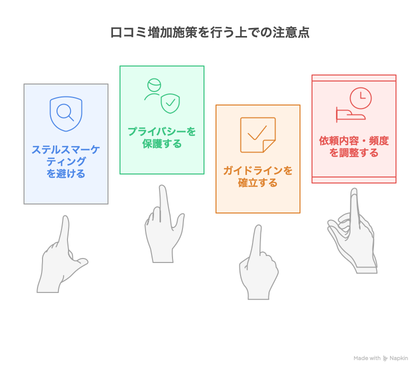 口コミ施策は効果的ですが、適切に運用しなければ逆効果になることもあります。下記のような点に注意しましょう。