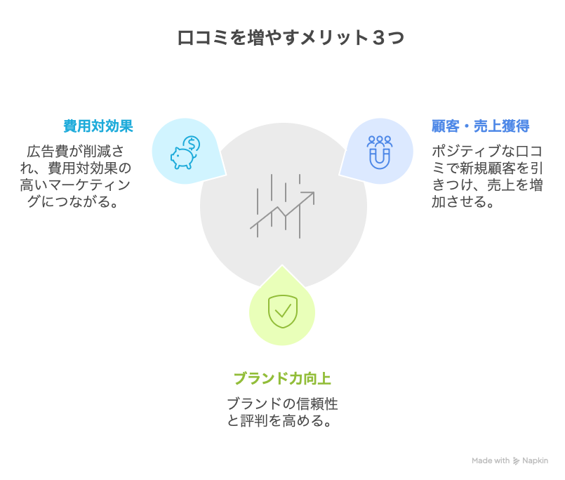 口コミが増えることで得られる代表的なメリットは次の3点です。