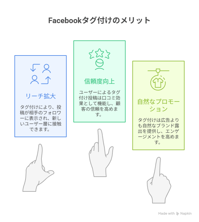 Facebookタグ付けには、単なる便利機能以上の効果があります。リーチ拡大や信頼度向上、自然なプロモーションなど企業にも有効です。具体例を交えて、実際の効果を見ていきましょう。