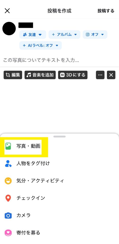 1.「投稿を作成」画面で、下部のリストから「写真・動画」を選択します。