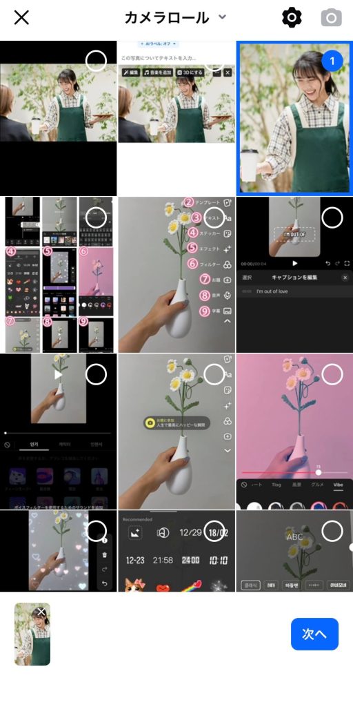2. カメラロールから投稿したい写真を選択して、右下の「次へ」を押します。