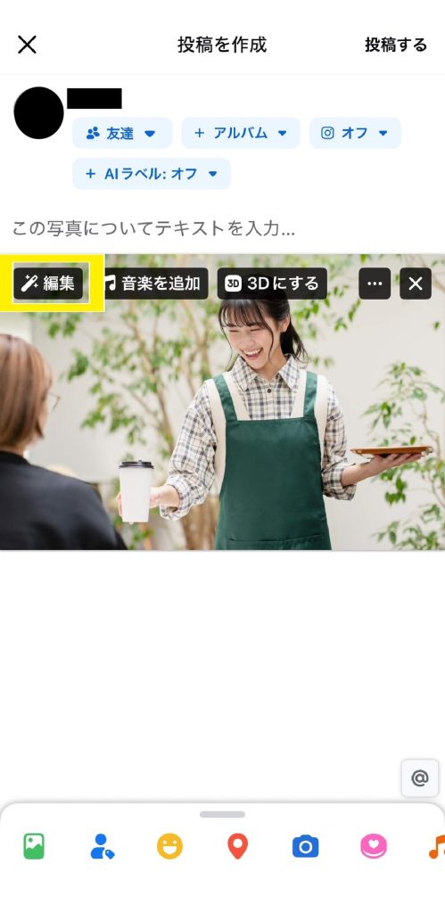 3. 自動的に以下の「投稿を作成」に戻るため、写真の左上にある「編集」ボタンをクリックします。