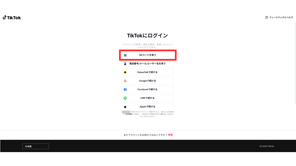 2.ログイン方法の選択:電話番号・メールアドレス・SNS連携でログインできます。今回は一番上の「QRコードを使う」を選択し、既存のTikTokアカウントにログインします。