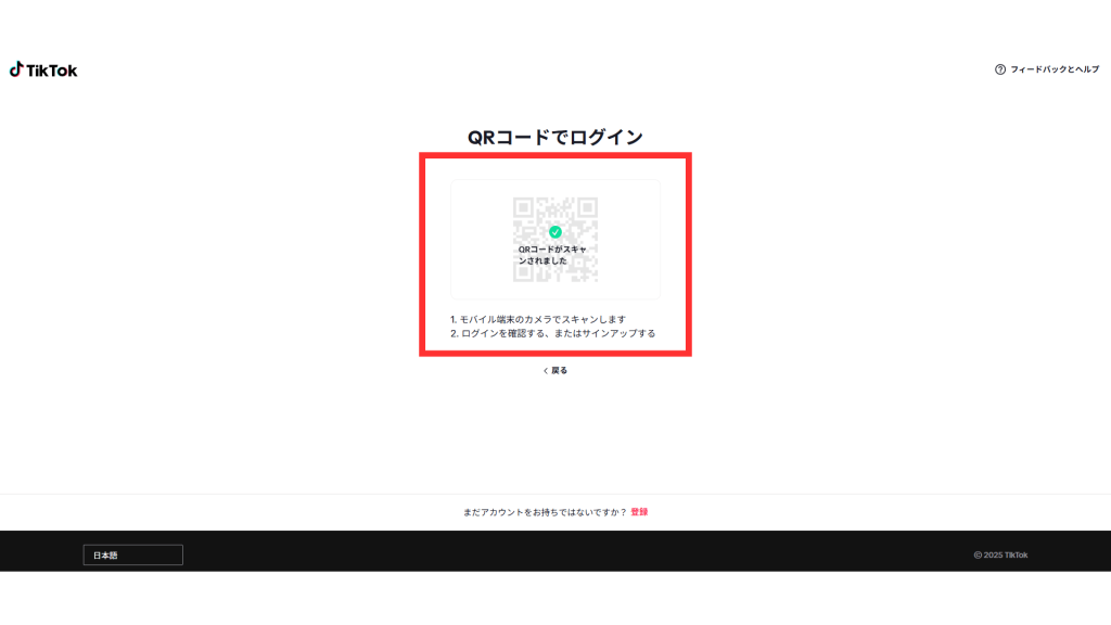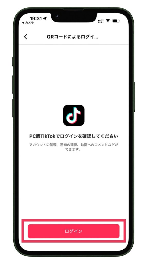 QRコードをスマホカメラで読み取ると、スマホのTikTokアプリが開きます。以下の画像のように、スマホ画面下部の「ログイン」をタップすると、PC側でのログインが完了します。