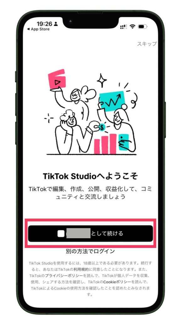 3.初回起動→ログイン:TikTok Studioを開き、「(TikTokアカウントID)として続ける」を選びます。登録方法(電話番号・メール・SNS連携など)と同じ手段でサインインしてください。