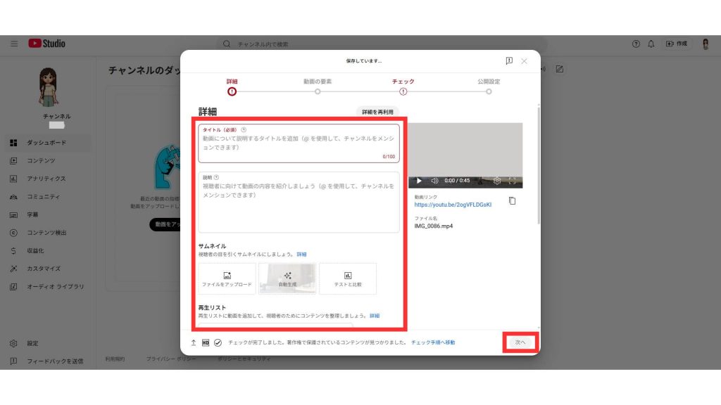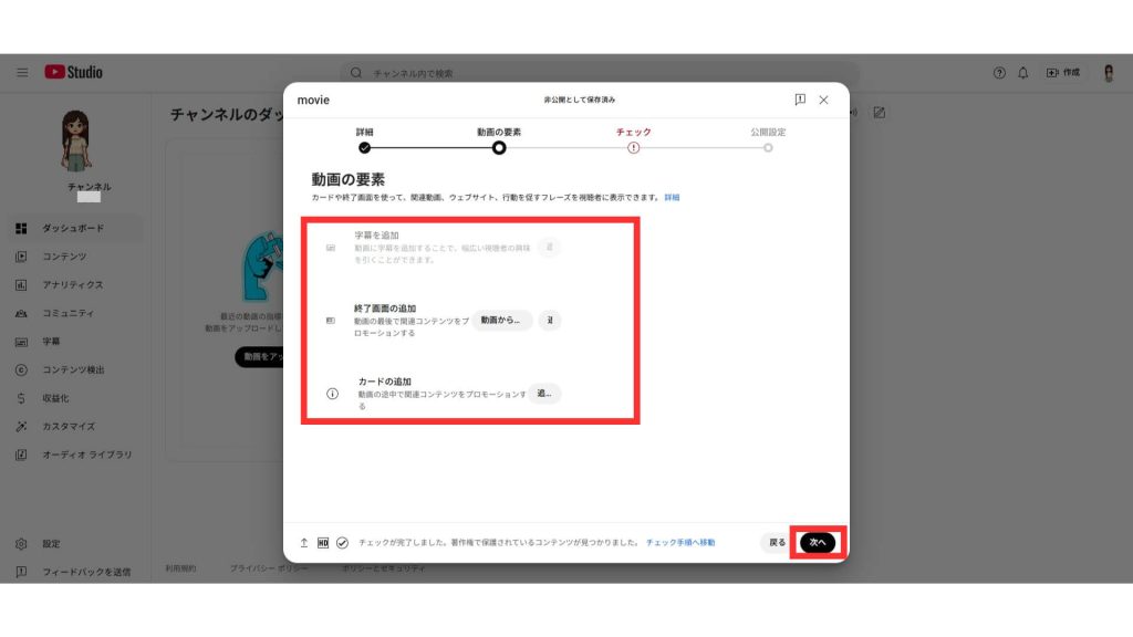 2.アップロードした動画の設定をします。タイトルや説明などの「詳細」、関連動画などの「動画の要素」を設定した後、「公開設定」へ進みます。