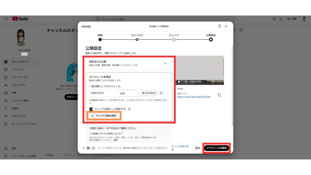3.「公開設定」で、動画の公開範囲(公開・限定公開・非公開)を選び、動画公開日時を設定、「プレミア公開として設定する」にチェックを入れます。「プレミア公開の設定」では、カウントダウンの長さや、カウントダウン中のテーマ(音楽と動画)を設定できます。すべての設定が完了したら、「スケジュールを設定」を押します。