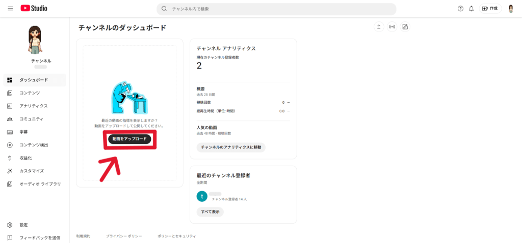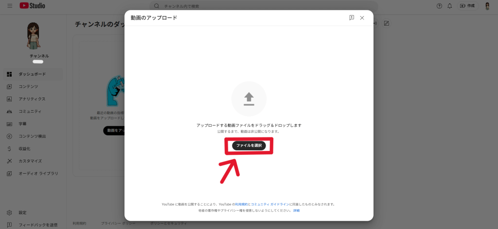 1.YouTube Studioにアクセスし、動画をアップロードします。