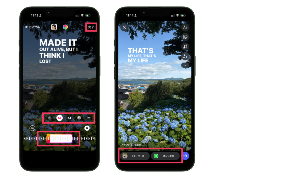 最後に、「ストーリーズ」か「親しい友達」を押すと、投稿が完了します。