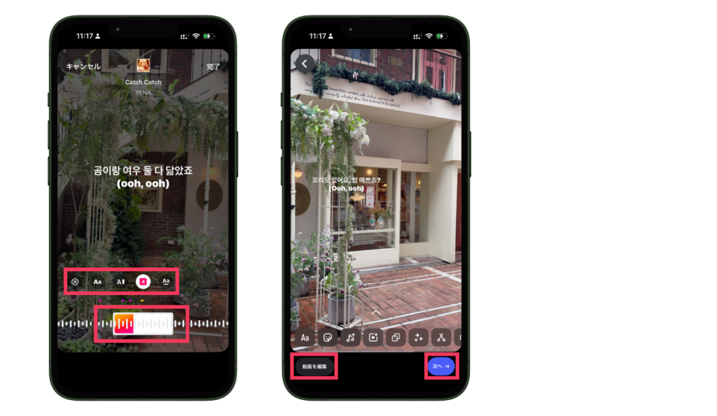 音源の表示方法(歌詞)と再生位置を選び、「動画を編集」を押すと、その音源に合わせて動画を編集できます。また、動画編集後に音源を追加することもできるため、投稿の完成イメージに合わせて調整することが可能です。