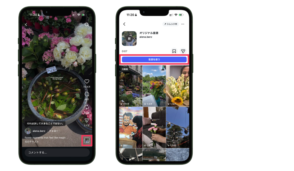 Instagramでは、他のユーザーが投稿したリール動画の音源をそのまま利用できます。動画の右下に表示されている音源アイコンをタップすると、その音源のページに移動します。そこから「音源を使う」を選択します。