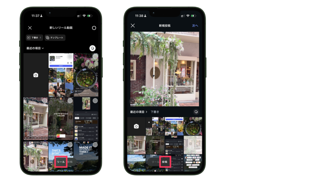 画面下部で「リール」と「投稿」のどちらかを選んで、オリジナル音源を用いたコンテンツの作成が始められます。