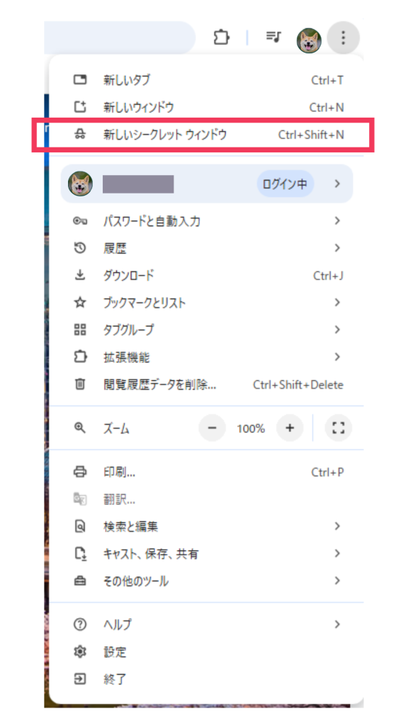 ブラウザの左上の「Google Chromeの設定」から「新しいシークレットウィンドウ」を選択すると、表示されます。