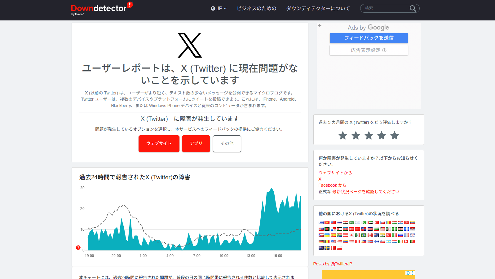 - https://downdetector.jp/shougai/twitter/のような、リアルタイムでXでの障害発生を知らせるサイトの確認も有効です。