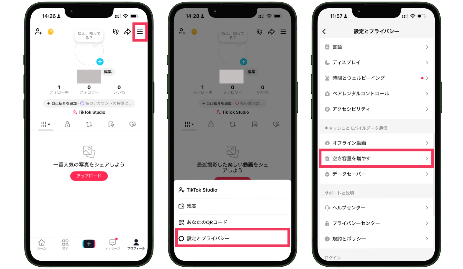 - プロフィール右上の三本線から「設定とプライバシー」を選択し、「空き容量を増やす」に進みます。