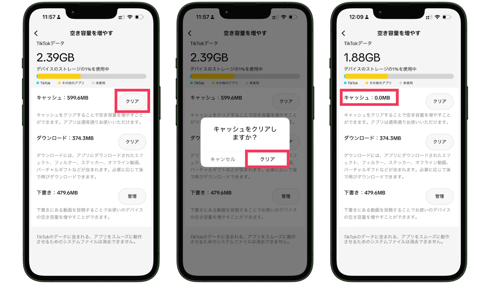 アプリのキャッシュが溜まると、動作が不安定になることがあります。その場合はキャッシュを削除して空き容量を増やしましょう。