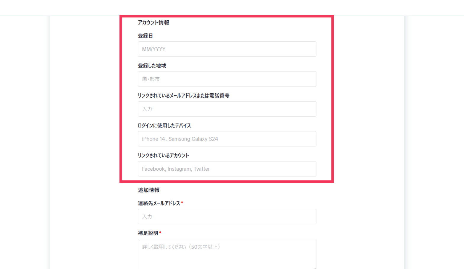 - 「連絡先メールアドレス」と、アカウントにログインできないことについての「補足説明」および「スクリーンショット(任意)」を添付します。最後に「送信」を押して完了です。