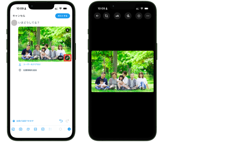 使い方は、まず通常どおり投稿作成画面で画像を追加するところから始まります。写真を選んで投稿画面に表示したあと、画像の右下にあるペンのようなアイコンから編集画面へ進めます。